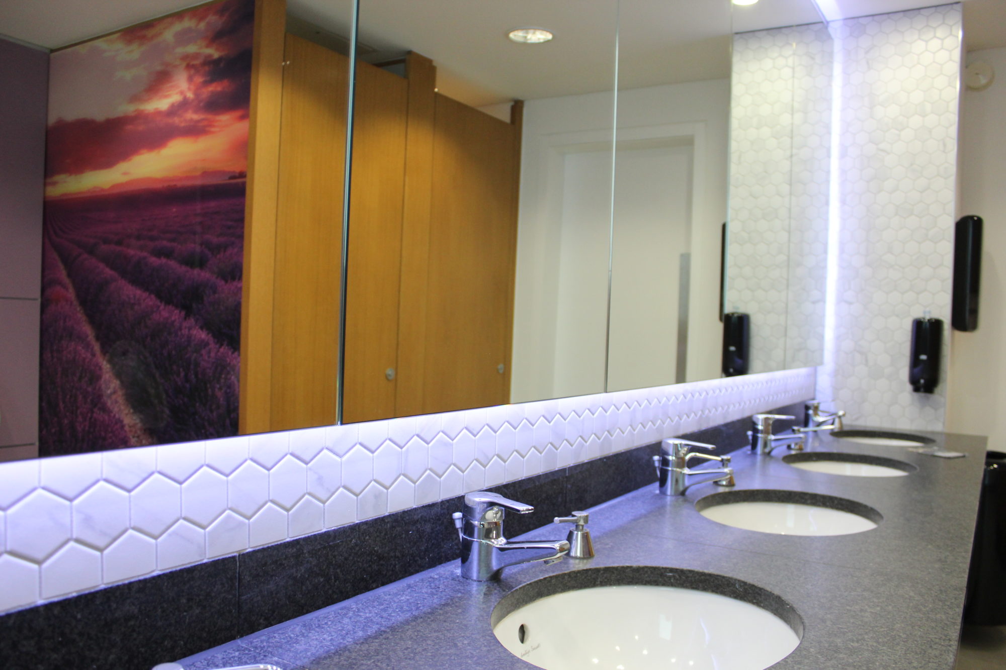 Digitally printed acrylic splashbacks added a unique visual element to each washroom: